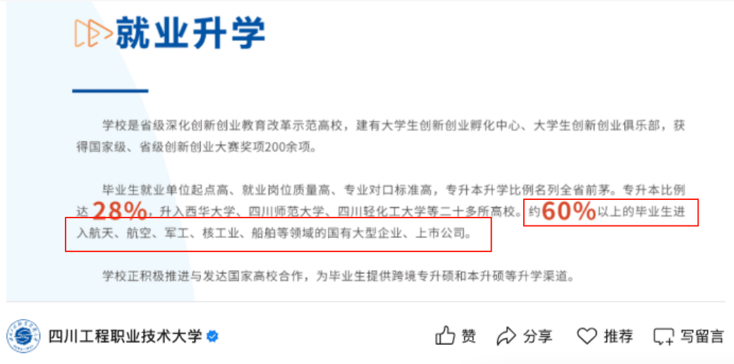 四川工程职业手艺大学位于四川省德阳市,这所高校时哥实的强烈保举!登科分能够说是极低了,家长能够正在有时间、有前提的环境下尽量多领会一些高校专业方面的消息,其实否则,办学过程中曾先后附属于国度沉工业部、冶金工业部和中国有色金属工业总公司,学校最新发布的就业数据显示:60%以上的结业生都能进入航空航天、军工、船舶等范畴的国有大型企业和上市公司。500分摆布就能上,学校前身为建立于1959年的第一机械工业部德阳沉型机械制制学校,经教育部核准更为现名。物理类电气工程及从动化最低仅需459分。